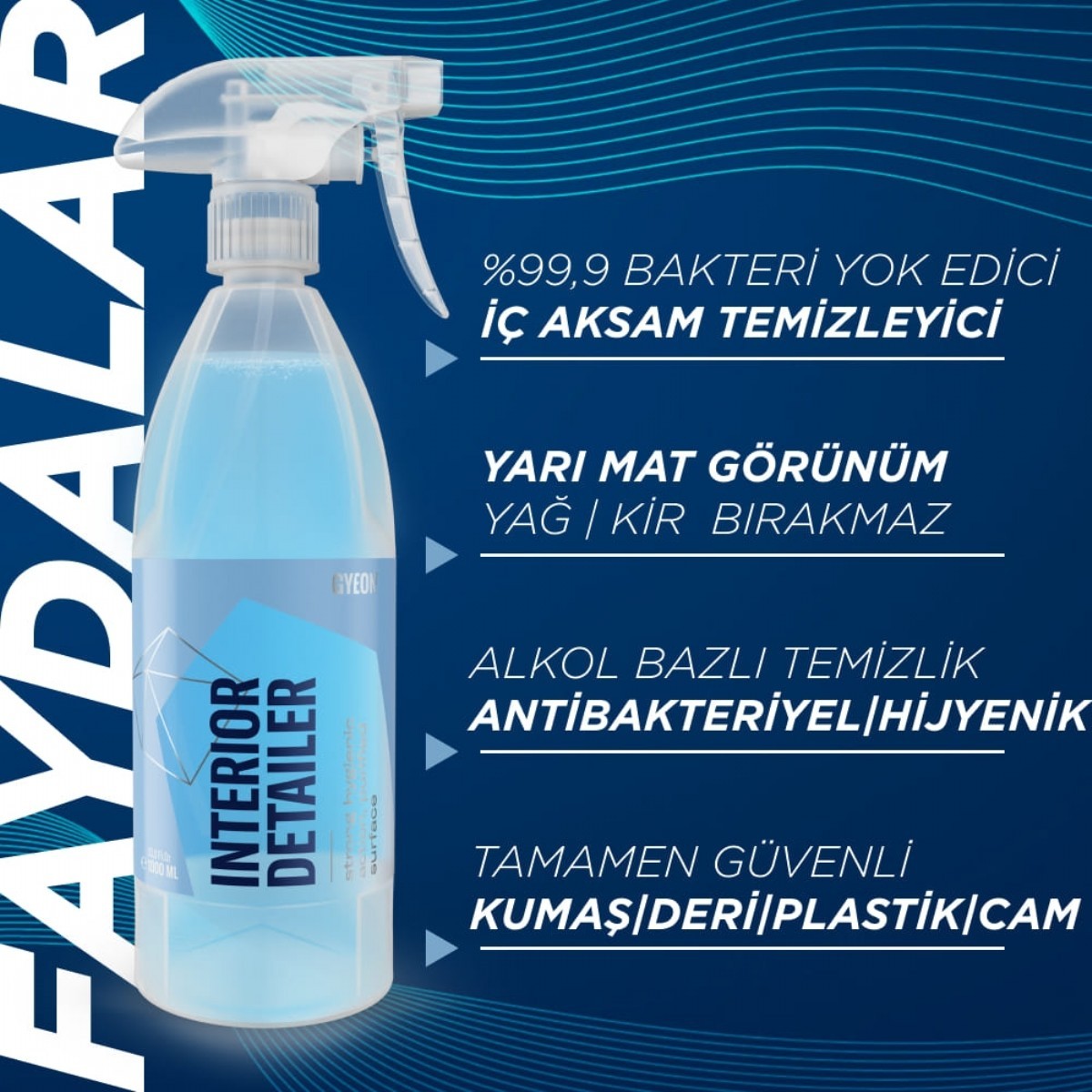 GYEON Q²M InteriorDetailer, araç içi, ev, ofis ve benzeri alanlarda kullanılabilen, dezenfektan etkili ve alkol bazlı iç detay temizleyicisidir. Bakterileri ve virüsleri yok eder, günlük kirleri hijyenik bir ÅŸekilde temizler. %60 alkol içeriÄŸi ile organik kirleri etkili bir ÅŸekilde temizler ve ferah bir iç mekan havası saÄŸlar.